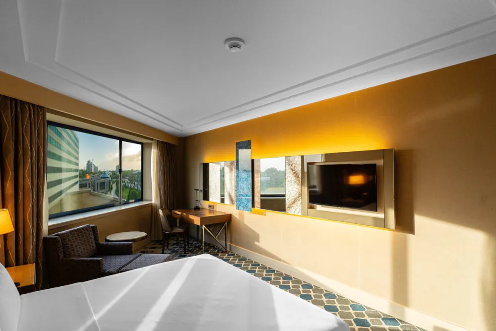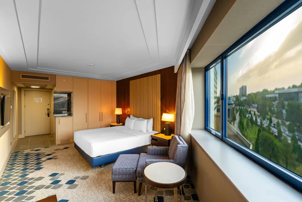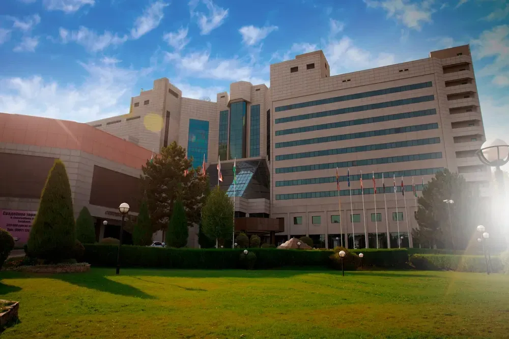 Azimut Grand расположен в живописной парковой зоне недалеко от центральной части города и знаковых достопримечательностей узбекской столицы. Удобное расположение позволяет быстро добраться до ключевых транспортных узлов: дорога на автомобиле от железнодорожного вокзала занимает около 15 минут, а от Международного аэропорта Ташкента – не более 30 минут. Напротив отеля находится станция метро Бадамзар, что делает передвижение по городу особенно удобным.
