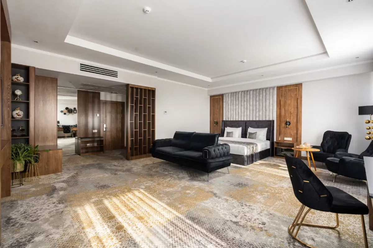 номер с отдельной гостиной и спальней. В номере: кровать king-size, гостиная-столовая зона, мини-кухня, 2 ванные комнаты