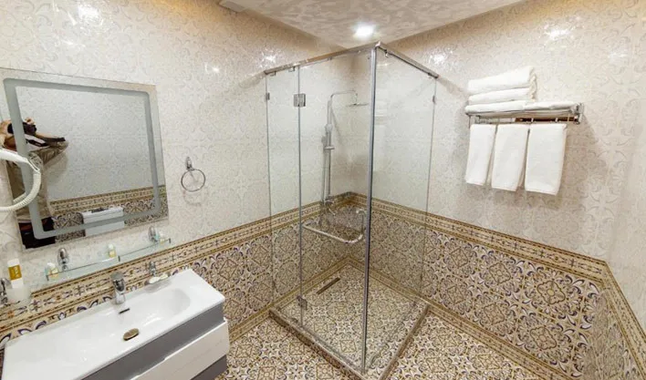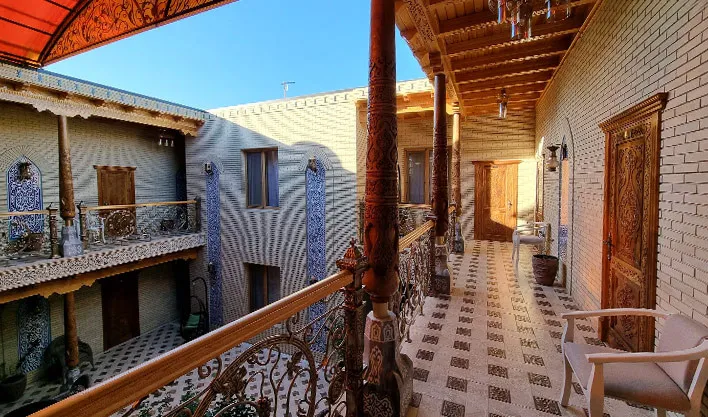 Здание выполнено в восточном стиле и гармонично вписывается в архитектуру Старого города. В интерьерах использованы традиционные элементы: резьба по ганчу и дереву, позолота, декоративные потолки, лестницы и мебель. Гостей ждут просторные номера, вкусные завтраки и высокое качество обслуживания.
