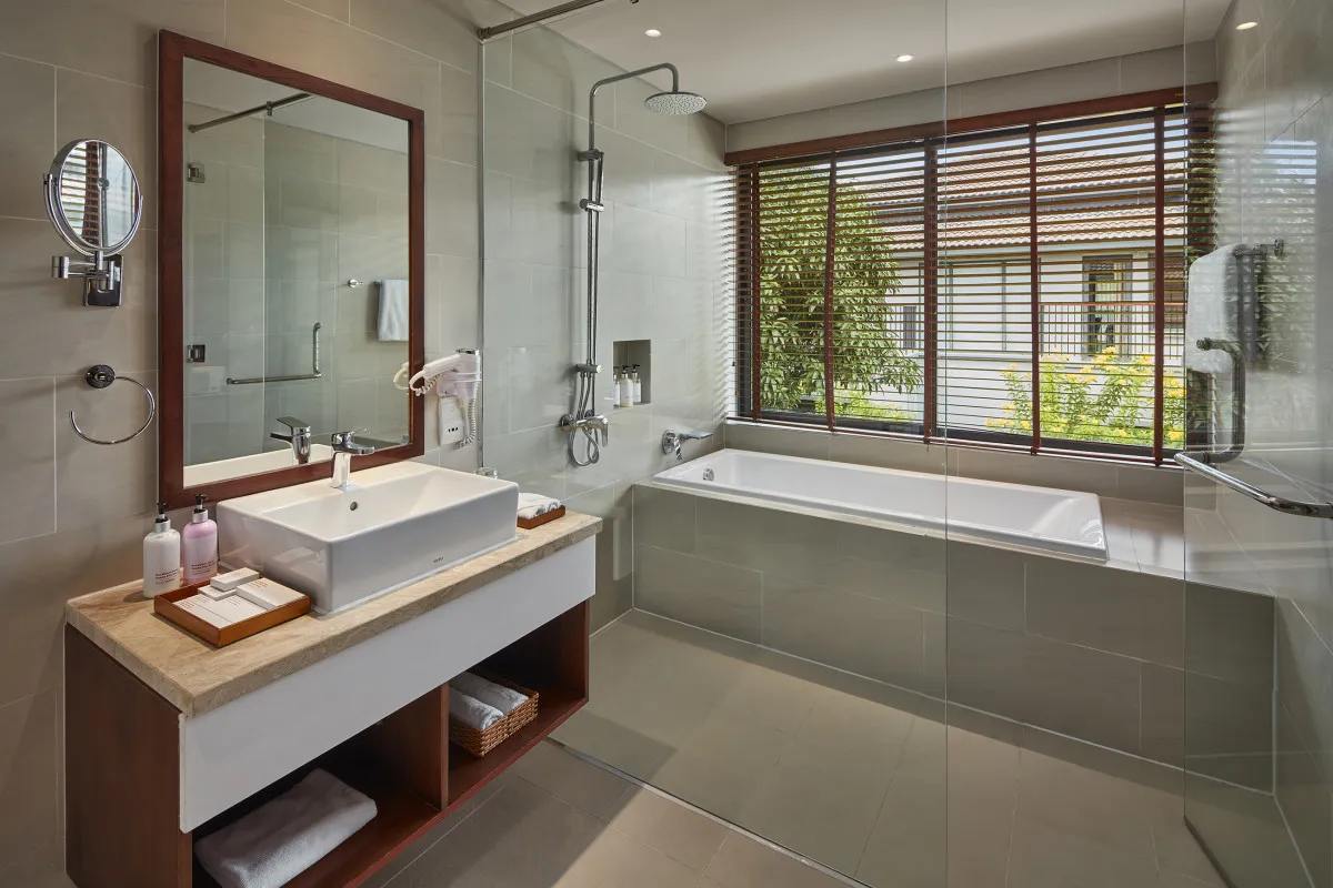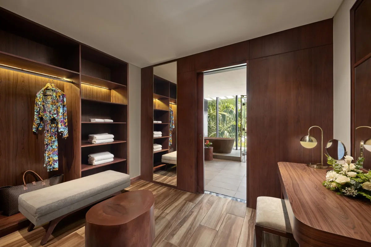200 м2, вид на сад и бассейн, частная вилла, 2 этажа, 2 спальни, межкомнатная дверь, гостиная, кухня, кухонные принадлежности (платно), 2 ванные комнаты, душ и ванна, собственный бассейн, балкон и терраса. Категория находится в Villa 3 Bedroom Private Poll (1 дверь будет заблокирована)